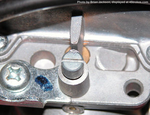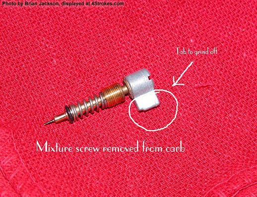 8) Grind off the tab on the mixture screw as shown, or as Dave did, grind the tab off the carb body instead of the mixture screw. See the following photo for the tab on the carb.