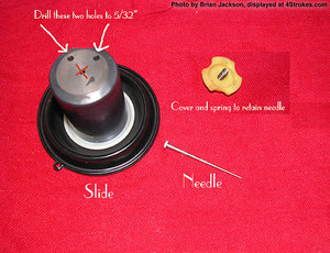 Needle Shimming. When removing the slide, the needle is held into the bottom of the slide by a little yellow widget that you press down on and turn a little with a screwdriver or an 8mm socket. When you remove the little yellow widget, the needle comes right out. Notice the needle sits in a small recess. Find a small washer that fits fairly snugly over the needle at the thickest part at the top. We suggest the JRU-8032 stainless steel washer, but individual preference may lead to a different choice. The needle will be raised by the thickness of the washer. Feel free to stack 1 or more washers to tune the needle for desired results.