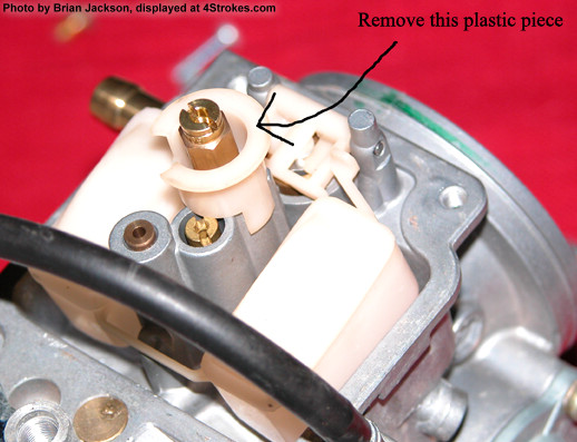 13) On the bottom of the carb, remove the plastic piece (baffle) that is partially covering the pilot/slow jet. Note: If you use the longer style pilot/slow jet, you will need to clearance the baffle to accommodate it.