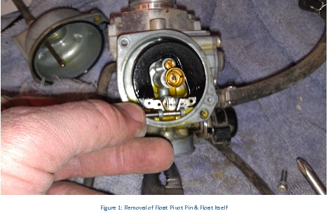 - Remove the float assembly. It rotates on a removable pin that slides out. Carefully lift the float away and keep the float needle on it if possible. (Note: You don’t HAVE to remove the float to replace the jets. However, I’d recommend removing it to allow full cleaning, inspection and familiarity with your bike).