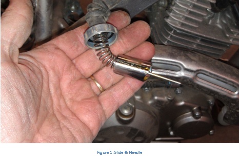 - Unscrew the top of the carburetor and lift out the slide mechanism. (There is a vent line that crosses the top of the carb, this allows it to be pulled to the side and allow lifting of the carb later).