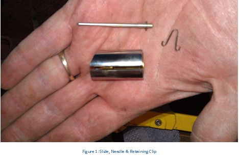 - Back at your work area, remove the needle retaining clip from inside the slide. Or, you can gently push the needle up and it will push the clip out. (Be careful, don’t shoot anything across the room).