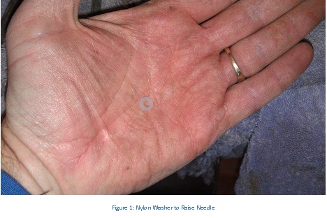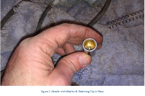 - Place one of the new nylon washers under the existing needle clip and drop the needle back into the hole in the slide. (This will raise the needle slightly).