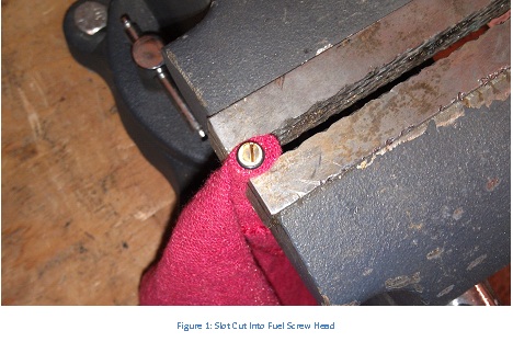 - Wrap the fuel screw with a rag. Put it in a vice with the threads above the top of the vice. The vice only needs to be tight enough to hold the screw still as you saw a slot in it.